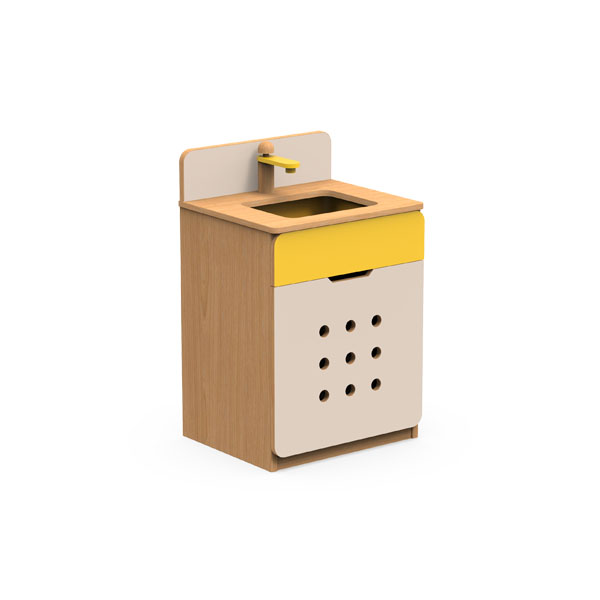 Plateau, façades et panneau arrière en contreplaqué de bouleau de 18 mm recouvert de thermocollé, avec bords vernis et coins arrondis pour plus de sécurité. Plateau en hêtre, façade inférieure et panneau arrière en beige et façade supérieure dans l’une des couleurs disponibles.