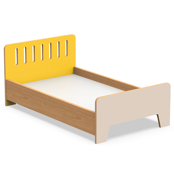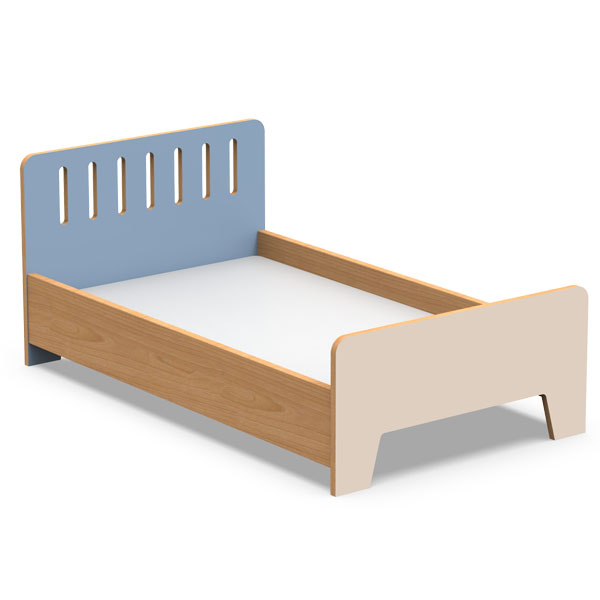 Tête et pied de lit en contreplaqué de bouleau de 18 mm recouvert de thermocollé, avec bordures vernies et coins arrondis pour plus de sécurité. Pied de lit de couleur beige et tête de lit dans l’une des couleurs disponibles.